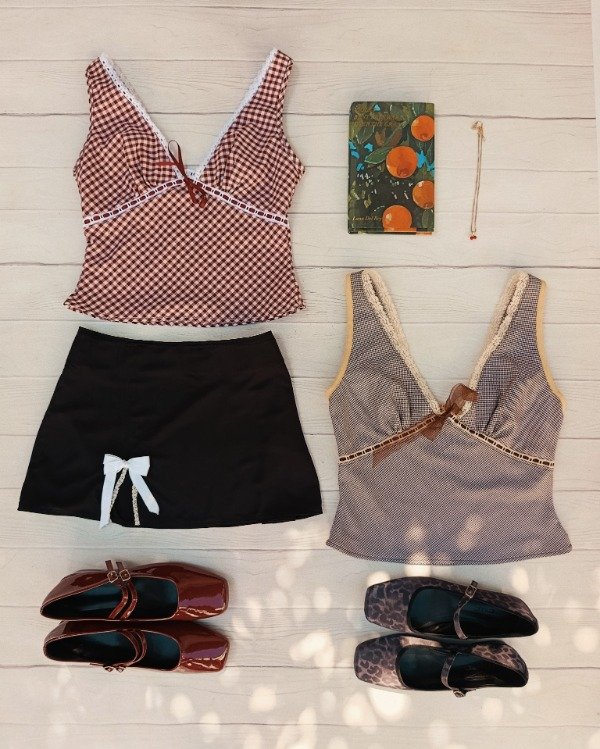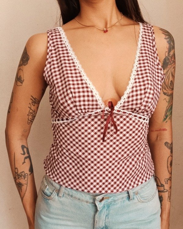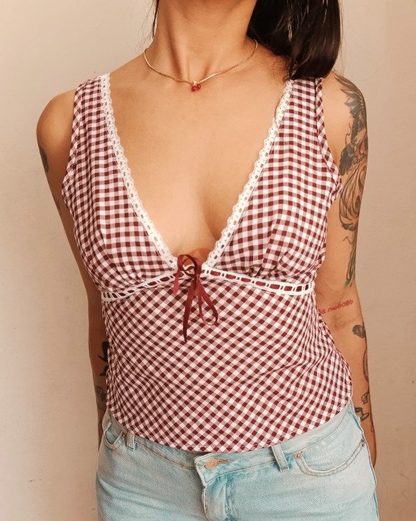 Top a cuadros con puntilla en el escote y pasacinta para ajustar en el bajo busto.